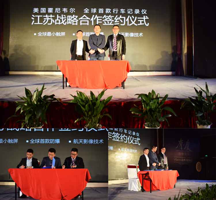 JADO捷渡智能(中國)營銷中心總經理陳問文先生與揚州天泓汽車貿易有限公司總經理施德春先生、蘇州天通汽車服務有限公司總經理周林海先生進行了霍尼韋爾行車記錄儀在江蘇地區的簽約授權儀式,這標志著霍尼韋爾行車記錄儀開啟了江蘇區域市場。