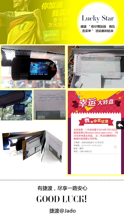 活動開始,參與人數較多,每天都會有新的獎項產生,但前三等大獎卻沒人中,直到6月28日一等獎,才被安徽的一位幸運觀眾摘取,價值12500元的70寸大電視,這位觀眾激動地說,這么好的獎品,準備留給兒子結婚用!也許是好運連連,7月1日有兩位幸運觀眾摘取了三等獎,價值2000元中石化加油卡。事情常出乎人意料,7月1日以后小獎是不斷有人中,前三等大獎卻是一直再沒有出來,直到活動結束前兩天,即7月12日,浙江余姚的一名姓楊的幸運者摘取了二等大獎,價值10000元加油卡,這位幸運者特別開心地給我們打電話來說,我一年的油費全省了?。≌娴氖?我盡情加油,捷渡負責買單",哈哈......