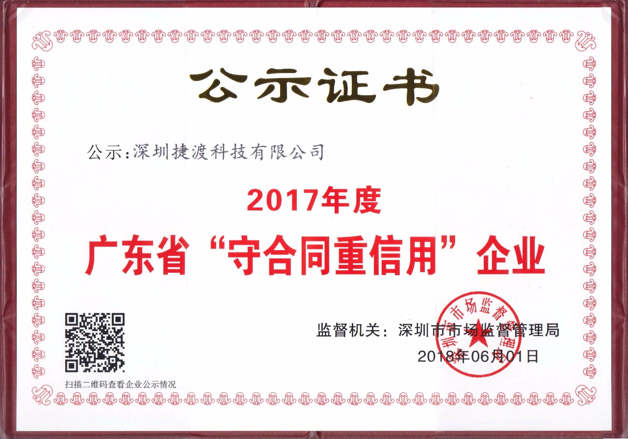 6月13日上午,2017年度廣東省“守合同重信用企業”的授牌儀式在深舉行。JADO捷渡智能(中國)獲頒 “守合同重信用企業”榮譽證書,這是社會各界和廣大企業對公司一貫嚴守合同信用、堅守商業誠信的高度評價和充分認可。
