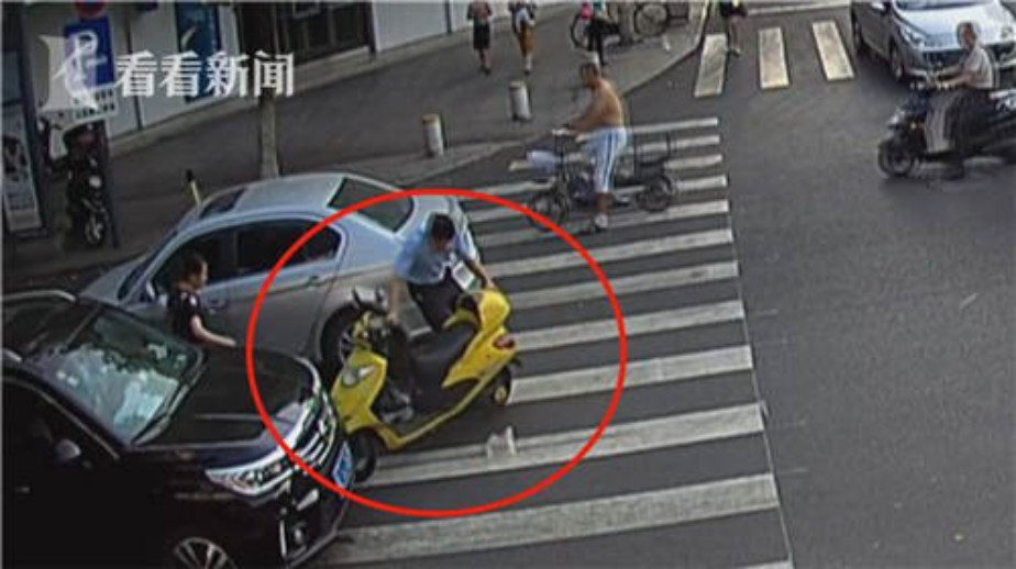 根據視頻顯示,駕駛非機動車的車主為躲避寵物的追逐,追尾了停在前方的銀色機動車,下車后,又因慣性碰到對向行駛來的黑色機動車。